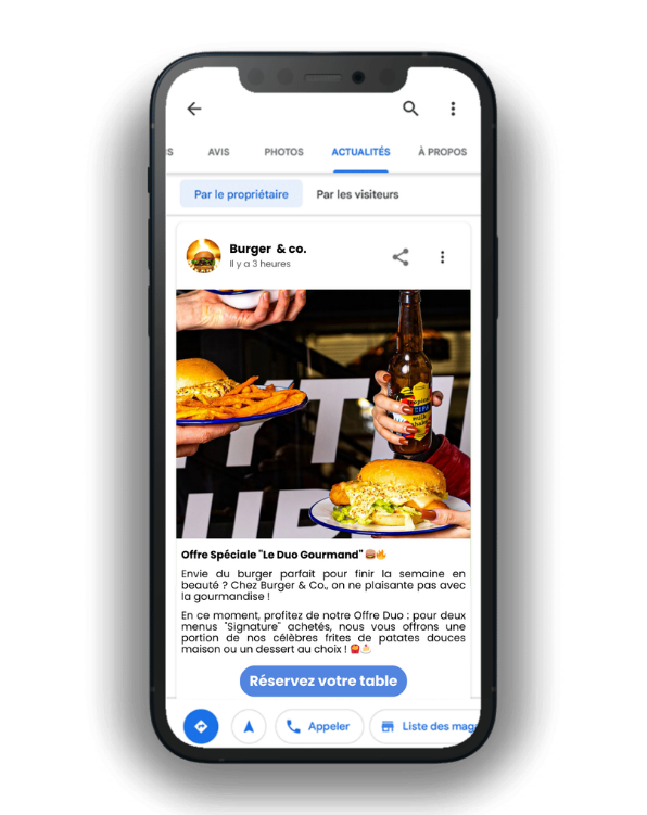 Photos optimisées : On ajoute régulièrement des visuels géo-tagués pour montrer que ton établissement est bien vivant et améliorer le référencement local de ta fiche.