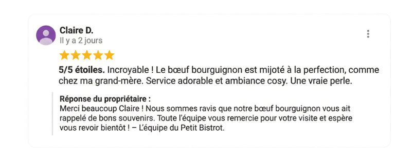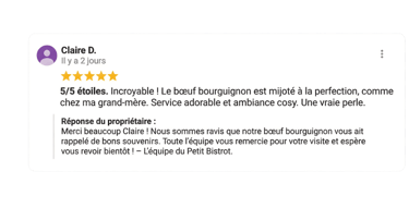 La relation client ne s'arrête pas à l'encaissement. Une réponse personnalisée et chaleureuse prolonge l'expérience, valorise votre clientèle et incite vos visiteurs à revenir. Faites de vos avis un véritable outil de fidélisation.